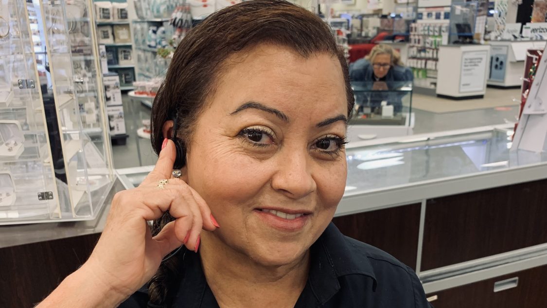 Fort Gordon is one of about two dozen stores using Theatro, which looks like something pop stars use on stage so they can keep their hands free instead of holding a mic. The headset comes with a small rectangular box that associates can attach to their belt or another part of their clothing. When associates need to talk to someone, they press a button on the box and call for assistance.