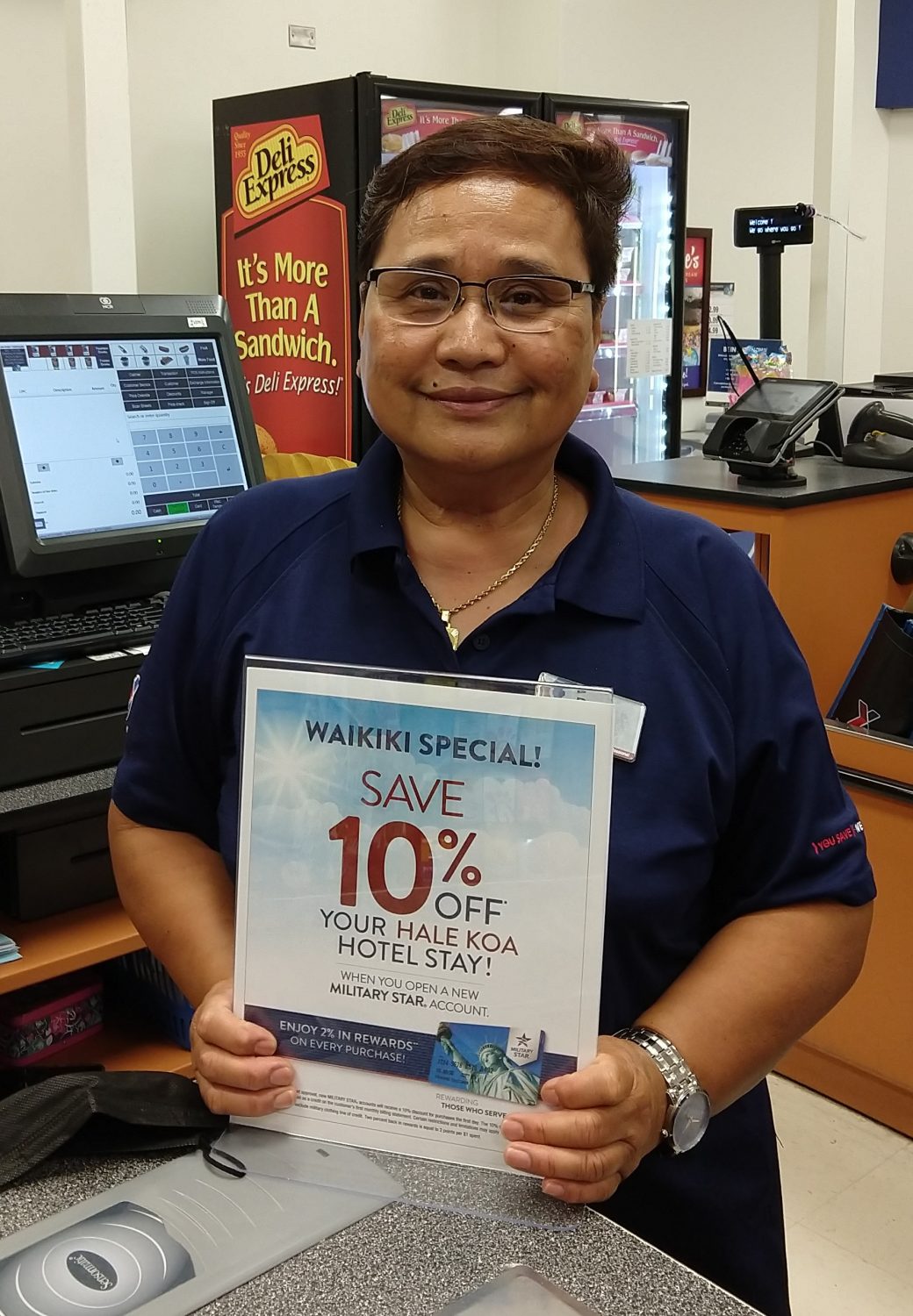 Miyong always comes to work prepared. โI make sure I know what the current MILITARY STAR promotions are so I can share that information with my customers,โ she said. She knows that most shoppers are always looking for ways to save. โThe new cardholder discount is stackable with other offers,โ said Miyong, who has been with the Exchange for more than a decade. โI let them know how to save on items they might already be buying in the first placeโ