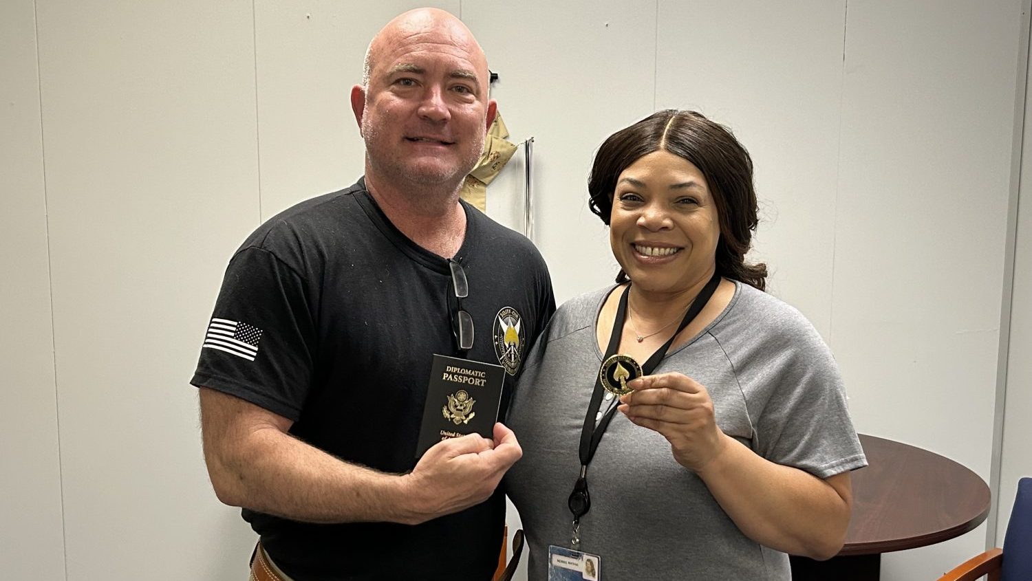 Green contacted Norris the week of April 8. By April 17, she had received his diplomatic passport. Green, who is based in the Dallas area, came by to pick it upโand presented her with his challenge coin for her help.