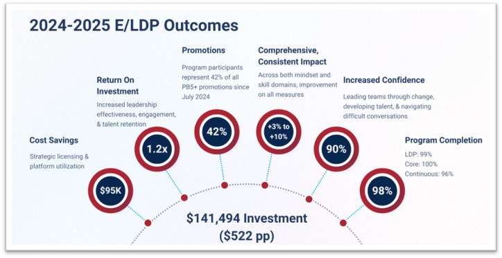 From a financial perspective, the program proved both efficient and impactful. With a total investment of $141,494—an average of $522 per participant—the program achieved over $95,000 in savings through strategic licensing and platform utilization. The estimated return on investment is 1.2x, based on measurable increases in leadership effectiveness, engagement and early indicators of talent retention and mobility.