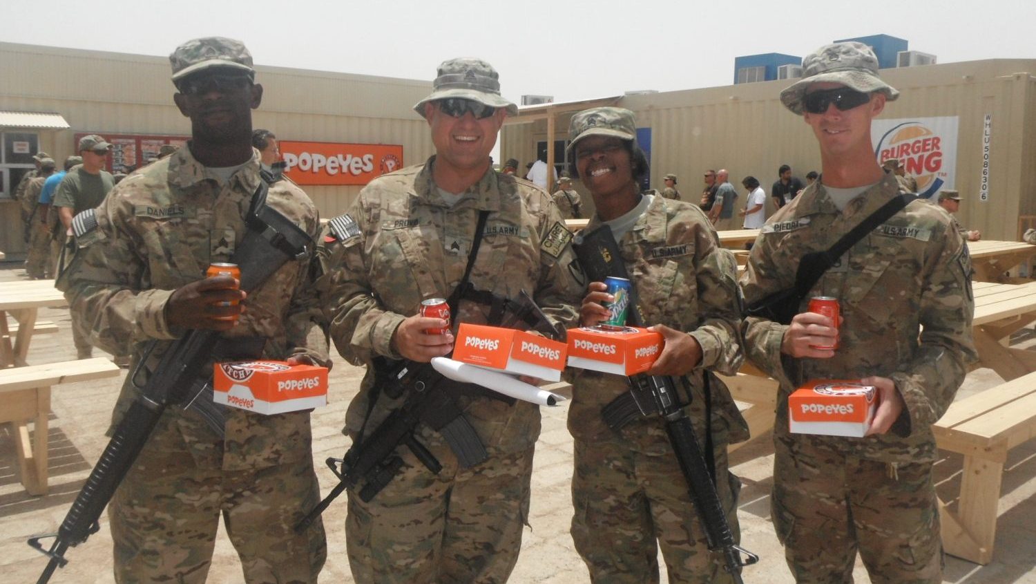 2012: Troops enjoy the Southern Afghanistan Exchangeโ€™s new Popeyes in Kandahar. The Popeyes was part of a food complex that also included Burger King, Pizza Hut and The Village, which served Afghan cuisine. Troops dubbed the complex โ€œThe Oasis.โ€