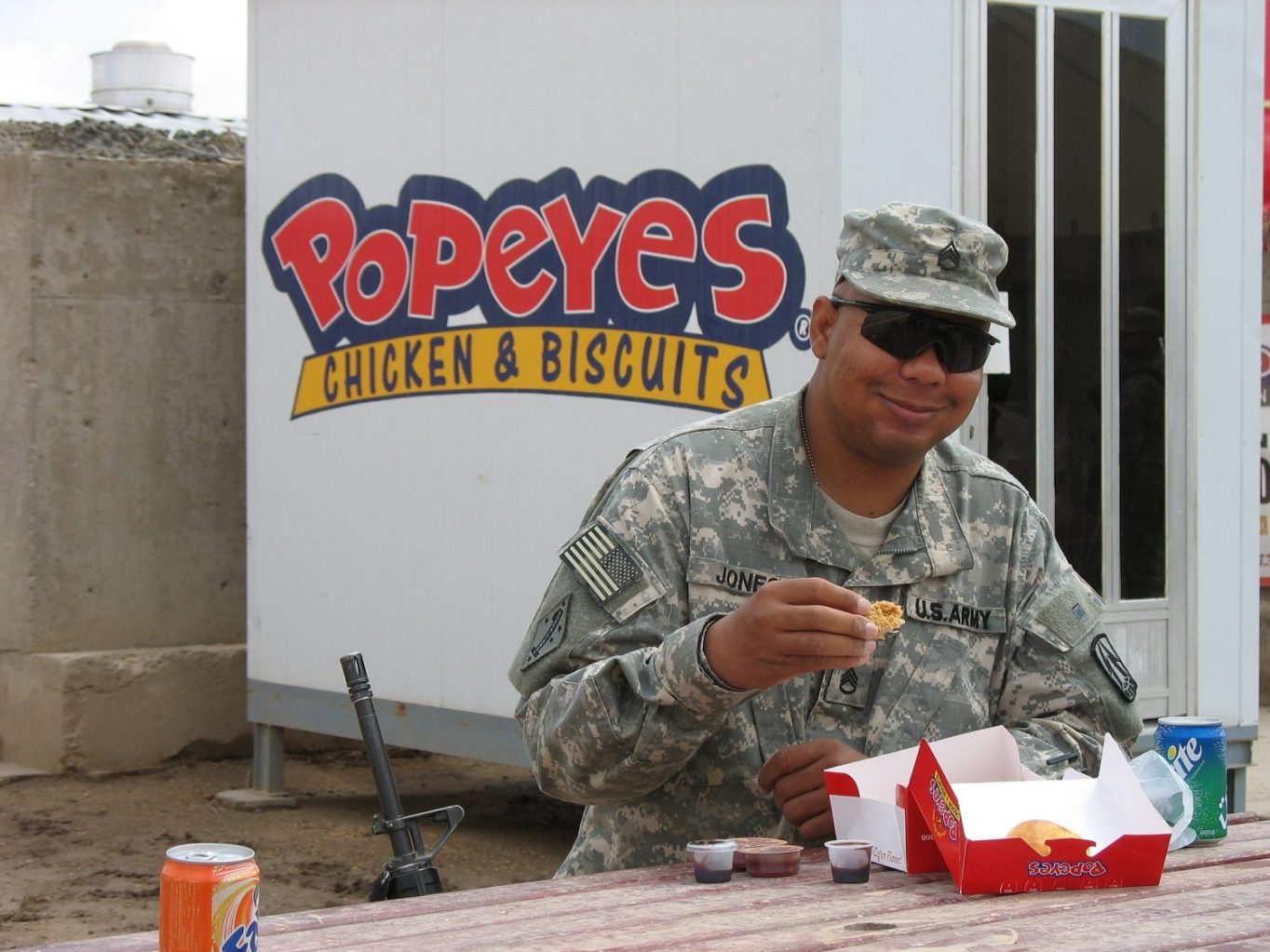 Circa 2004: A Soldier enjoys a โ€œtaste of homeโ€ at an Exchange Popeyes at an undisclosed location in Southwest Asia.
