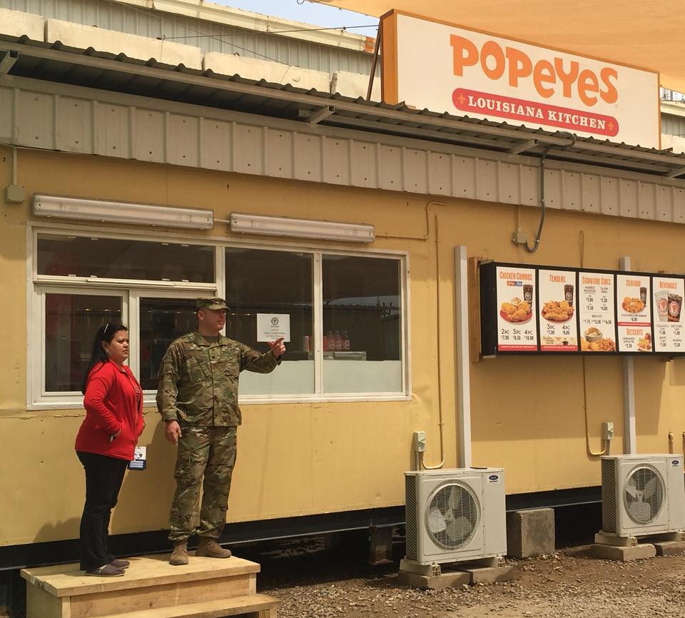 2018: Exchange Iraq GM Kristine Cowley joins LTC Harrelson, commander of the Union III military installation, at the grand opening of the first Popeyes in the country for Operation Inherent Resolve. Cowley is now the general manager of the Okinawa Consolidated Exchange.